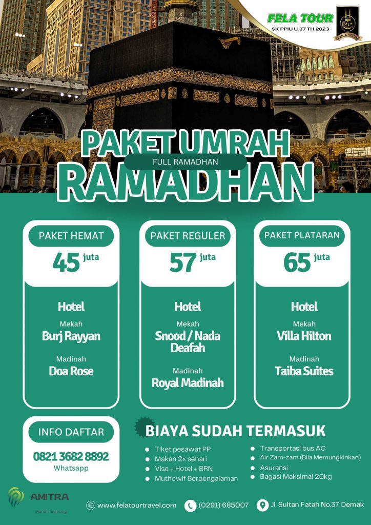 Ingin menunaikan umrah di bulan suci Ramadhan dengan fasilitas lengkap dan bimbingan muthowif berpengalaman? Pilih paket yang sesuai dari Fela Tour — resmi, terpercaya, dan siap memberangkatkan jamaah dengan aman.