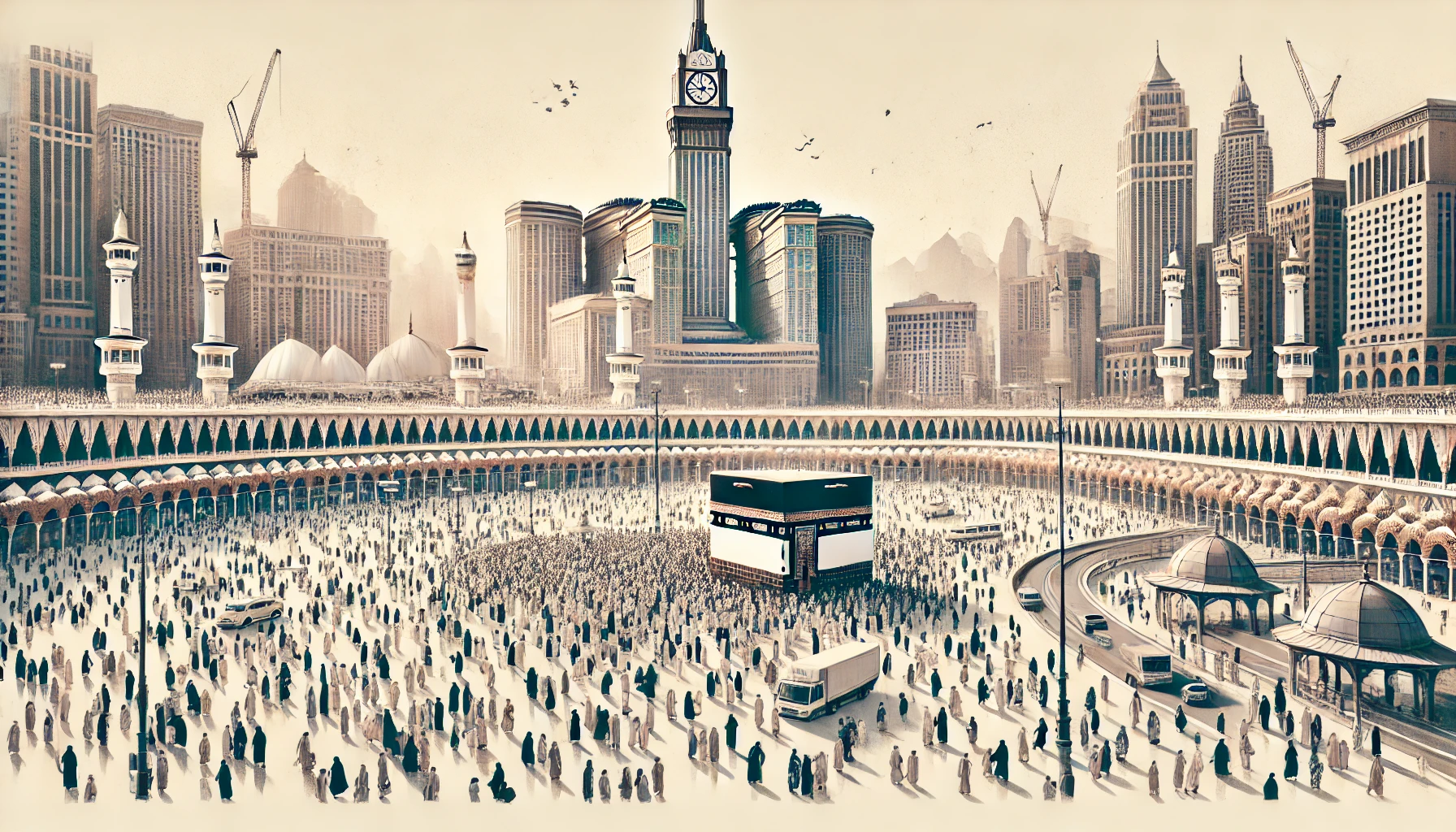 DALL·E 2024-12-15 11.43.34 – The same image of a bustling scene in front of the Grand Mosque in Mecca, featuring pilgrims and modern infrastructure, but with the addition of a sub