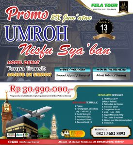 Fela Tour kembali menghadirkan paket umroh spesial untuk bulan Nisfu Sya’ban 1445 H. Dalam program perjalanan 13 hari, Anda dapat menikmati kenyamanan luar biasa dengan hotel yang dekat dengan Masjidil Haram dan Masjid Nabawi. Selain itu, Anda juga akan mendapatkan kesempatan umroh hingga 3 kali tanpa biaya tambahan.
